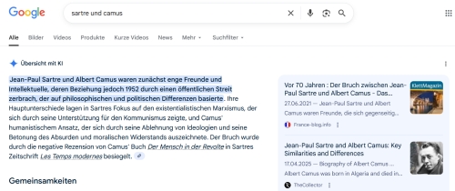 Vielleicht ist das sogar gefährlich, was Google uns damit anbietet: Versteckter Manipulation ist Tür und Tor geöffnet. Die KI soll intelligent sein? Nochmal, sie rechnet nur Wortnachbarwahrscheinlichkeiten aus ud gewöhnt ihren Besuchern das Denken ab.