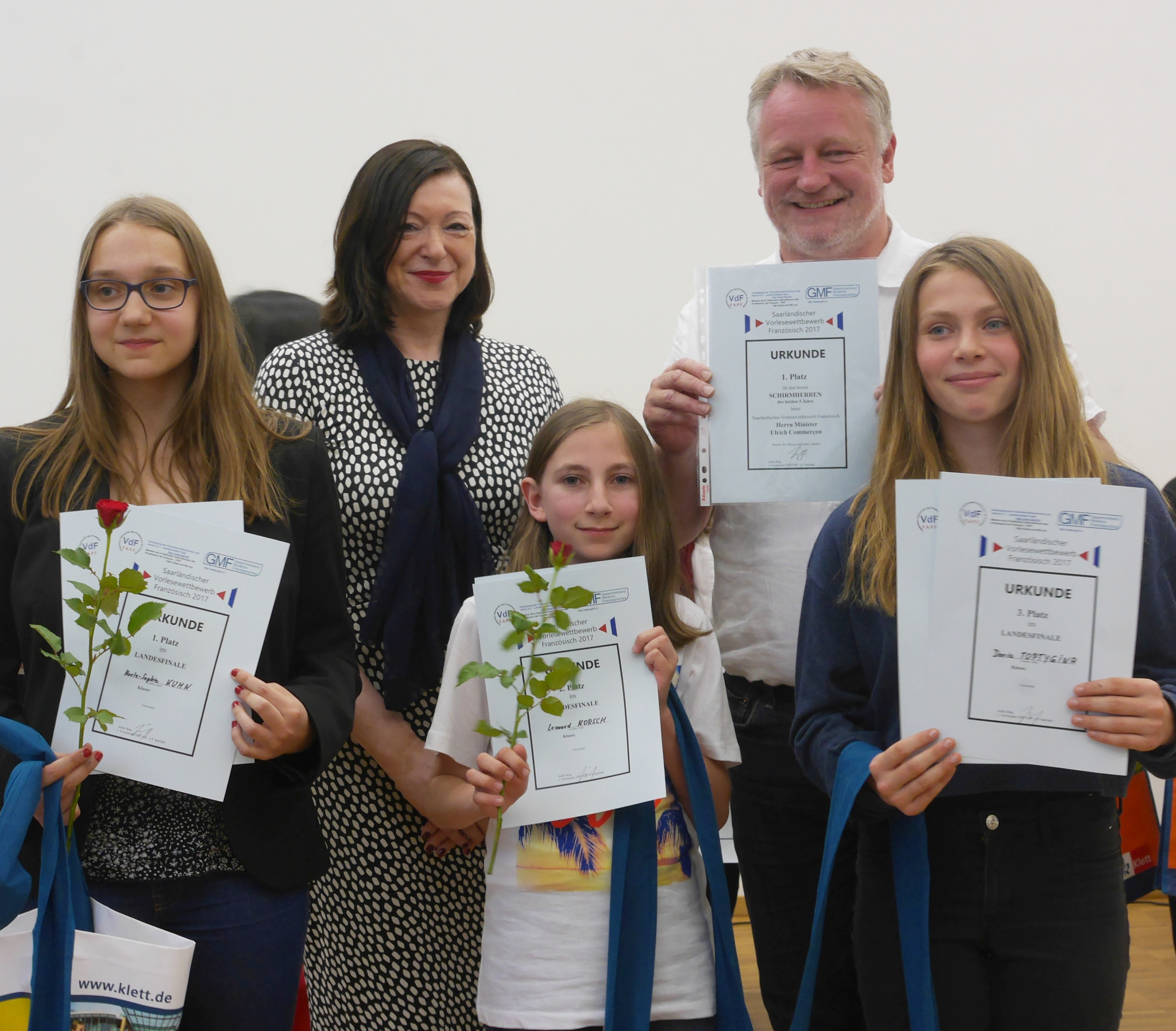Die strahlenden Sieger v. l. Marie-Sophie Kühn (8b), Leonard Morsch (7c), und Daria Toptygina (7D) mit Minister Ulrich Commerçon und Christa Weck, Leiterin der Abteilung Französisch im Ernst Klett Verlag: