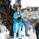 Jetzt zeigen wir hier, wie der Proviseur Patrick Stemmelin des Lycée professionnel Eugène Freyssinet in Verdun während des Rundgangs der Schüler zusammen mit dem Staatssekretär für die Anciens Combattants, Jean-Marc Todeschini, durch die Innenstadt von Verdun die Skulptur „Mémoire vive“ erläutert. Außeneinsatz des > transportablen TV-Studios von www.france-blog.info – ohne Stativ: